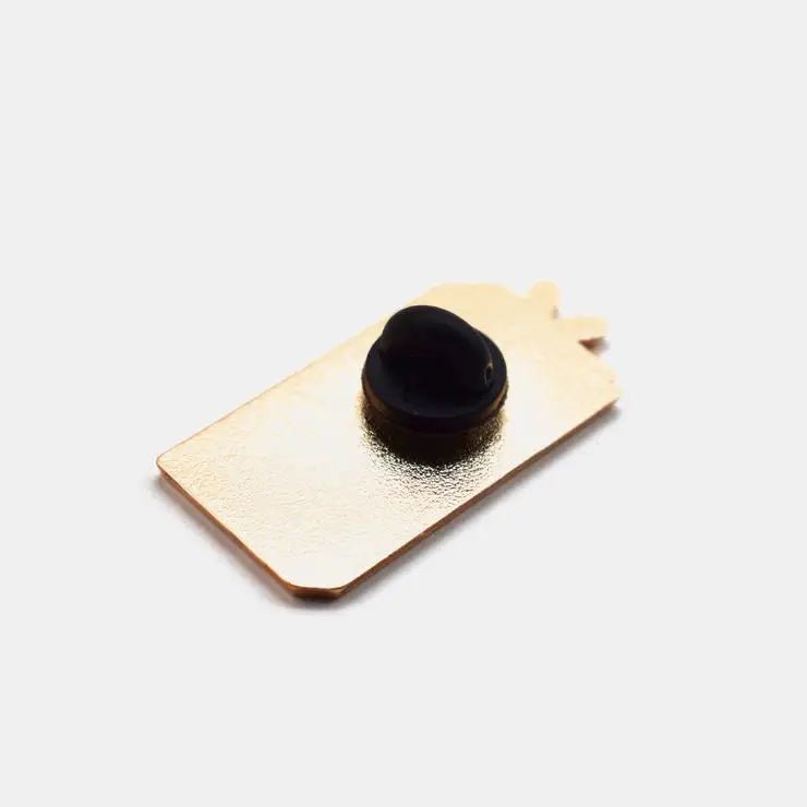 Soft enamel pin with gold outline, backing and rubber clutch.