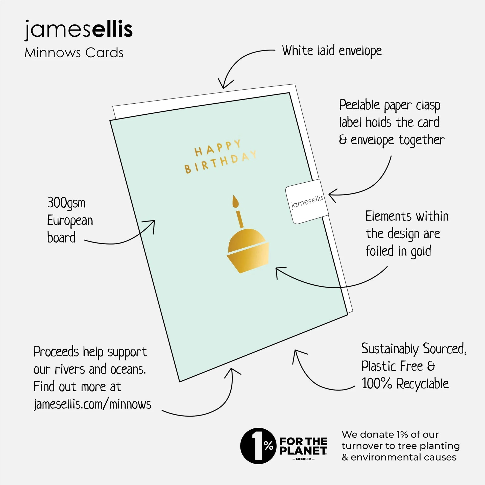 A beautiful just a note card illustrated by Bea Müller. The image on the front of the card features white birds and colourful flowers on a turquoise background. Elements within the design are foiled in gold.