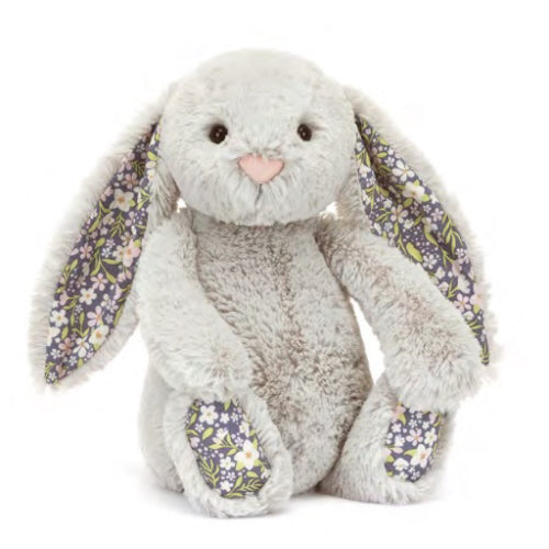 Jellycat Blossom Silver Bunny loves to go for a midnight stroll among the flowerbeds. In iconic silver-grey Bashful fur with a cream bobtail, Blossom Silver Bunny has soft cotton floral ears and feet, printed with an original Jellycat design of pink and white flowers scattered among a midnight blue backdrop. The perfect nighttime companion for all ages.