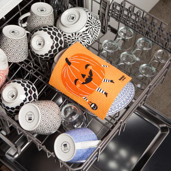 Indulge in a whimsical cleaning experience with the Boo Crew Pumpkin Swedish Dishcloth by Ecologie. This eco-friendly cloth soaks up messes, delicately scrubs surfaces, and even cleanses chocolate-covered fingers, providing a clever alternative to paper towels.
