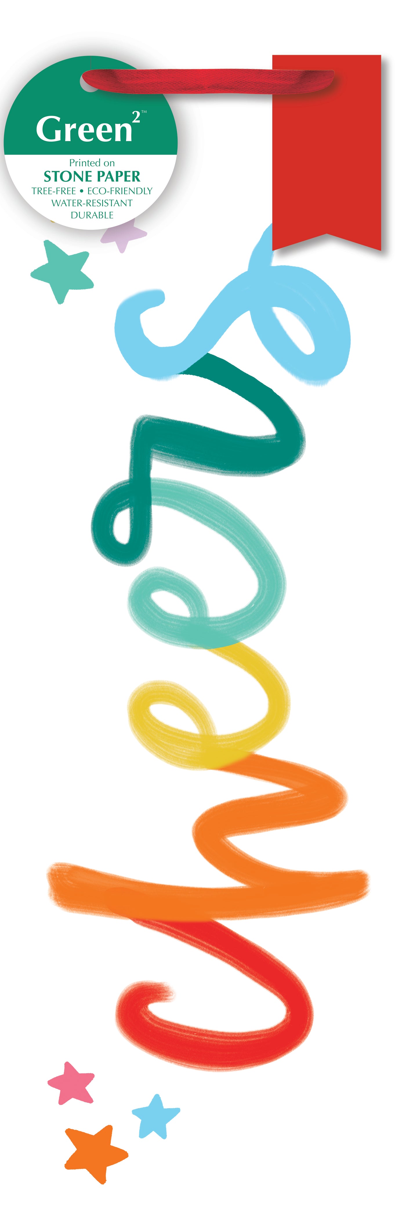 Give a cheerful gift with this eco-friendly bottle bag made from durable, tree-free stone paper. It features a colourful “Cheers” design, red handle, and matching tag—perfect for wine or champagne with a sustainable twist.