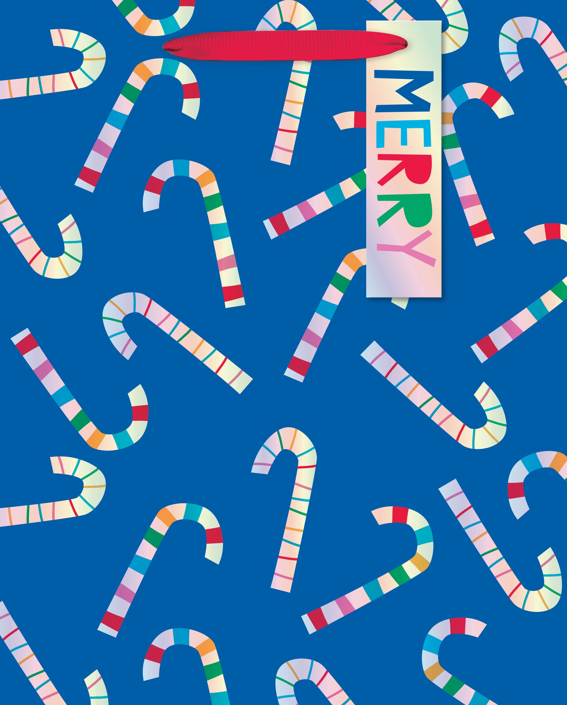 Make your gifts shine with this bright large bag! It shows colorful candy canes in shiny rainbow foil, has a bold red ribbon handle, and a matching "Merry" tag for a fun festive touch. Perfect for holiday cheer!
