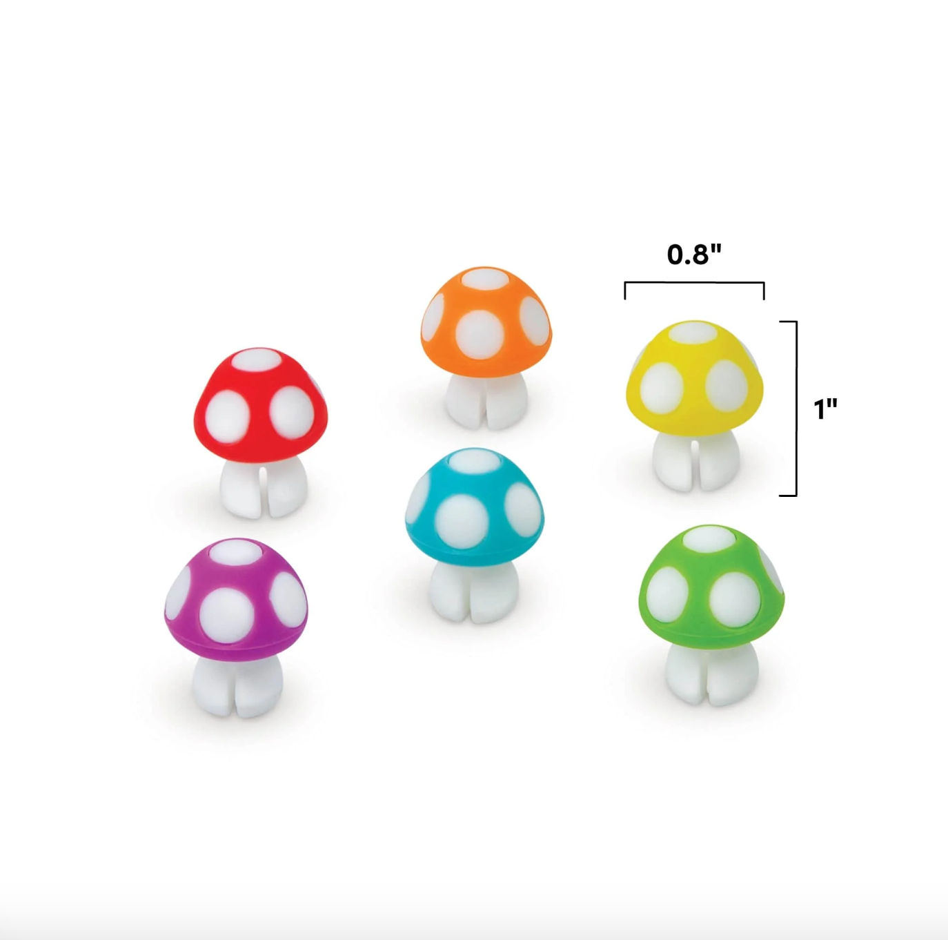 Set of six toadstool mushroom shaped drink identifiers. Made of BPA-free Silicone; and Phthalate Free. Each mushroom measures approximately .9 inch tall. Our Tiny Toadstools Drink Markers are ready to party!