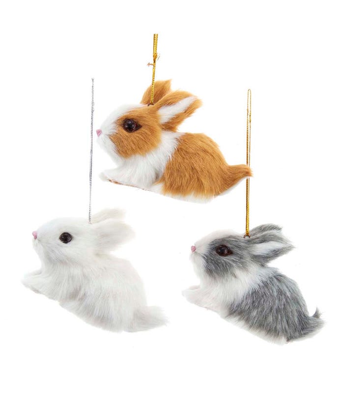 These furry baby rabbit ornaments are a fun addition to your home or holiday décor. This assortment includes a white, grey or brown baby rabbit.