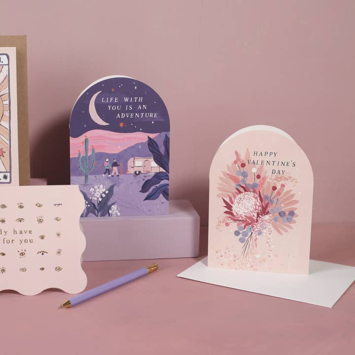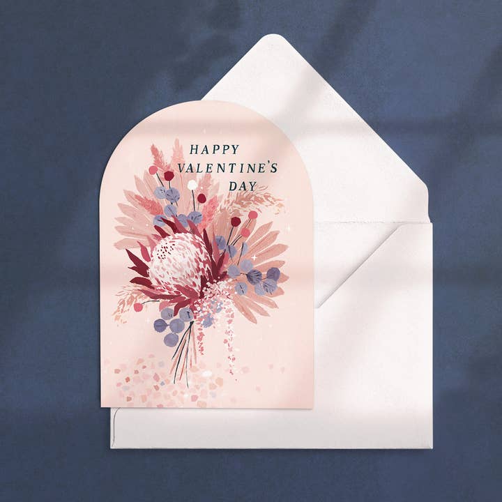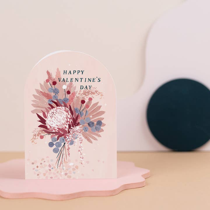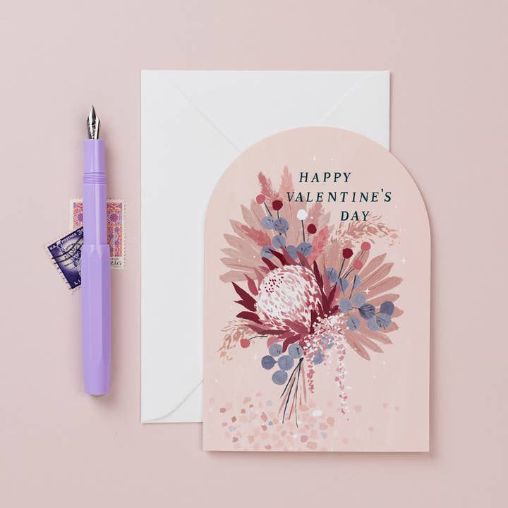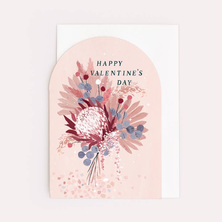 Valentine's card with illustration of modern, dried flower bouquet, perfect for Valentine's Day.