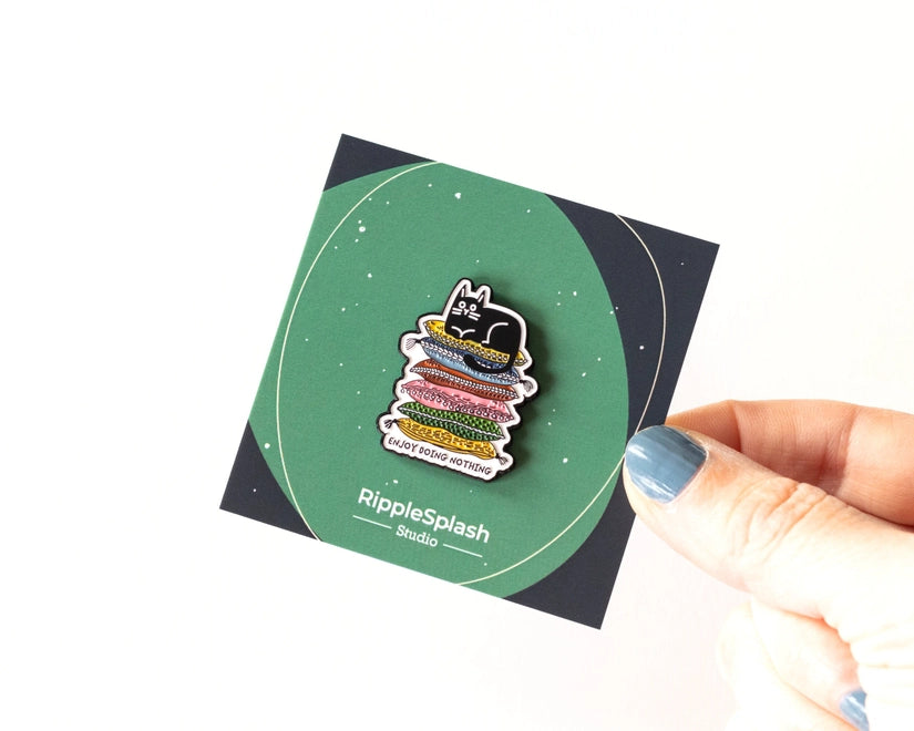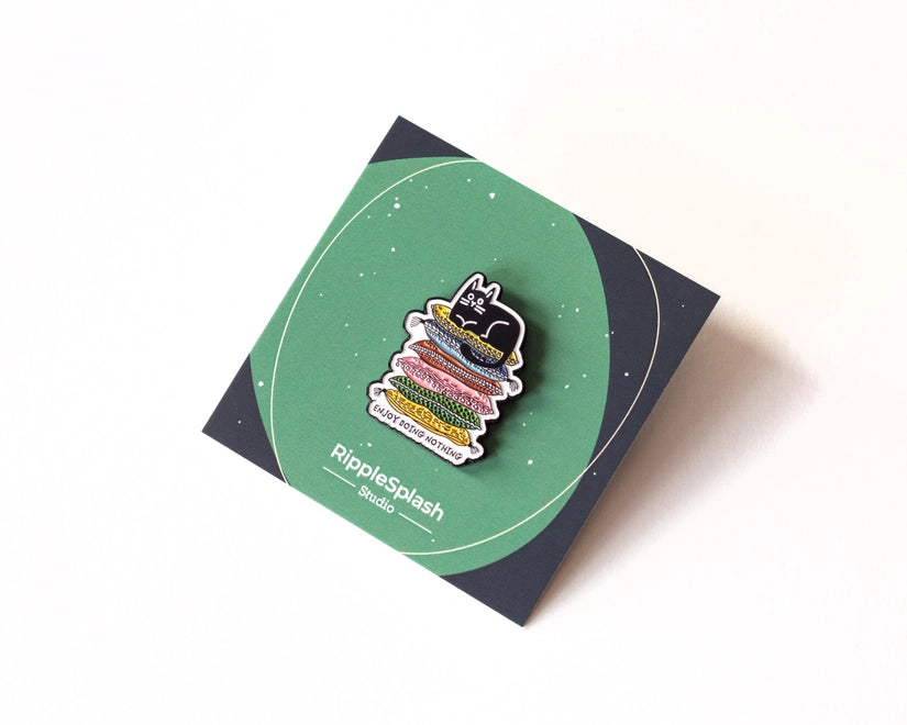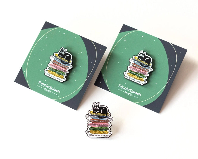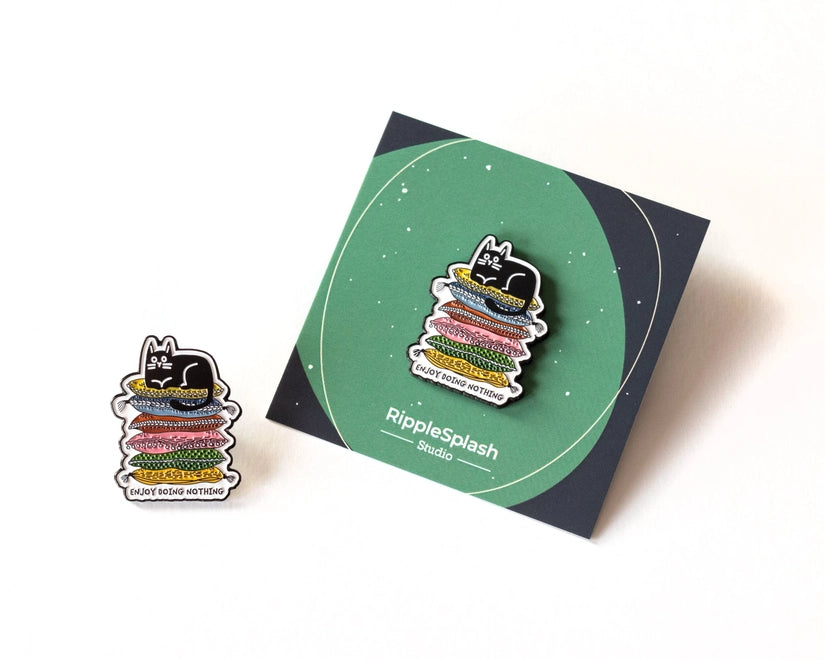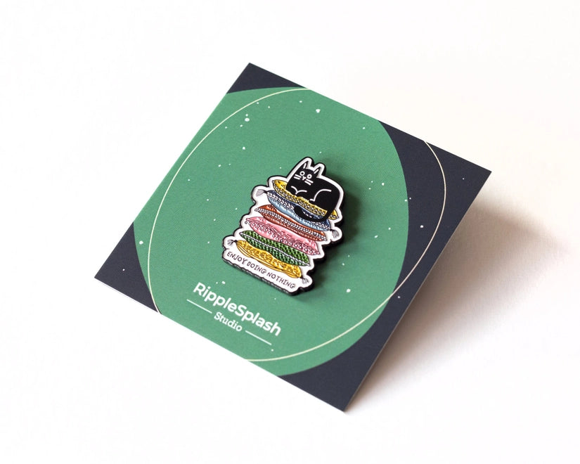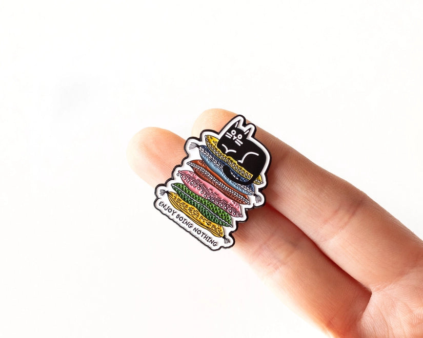Embrace the art of relaxation with this 'Enjoy Doing Nothing' enamel pin, featuring a content black cat perched atop a colourful pile of pillows.