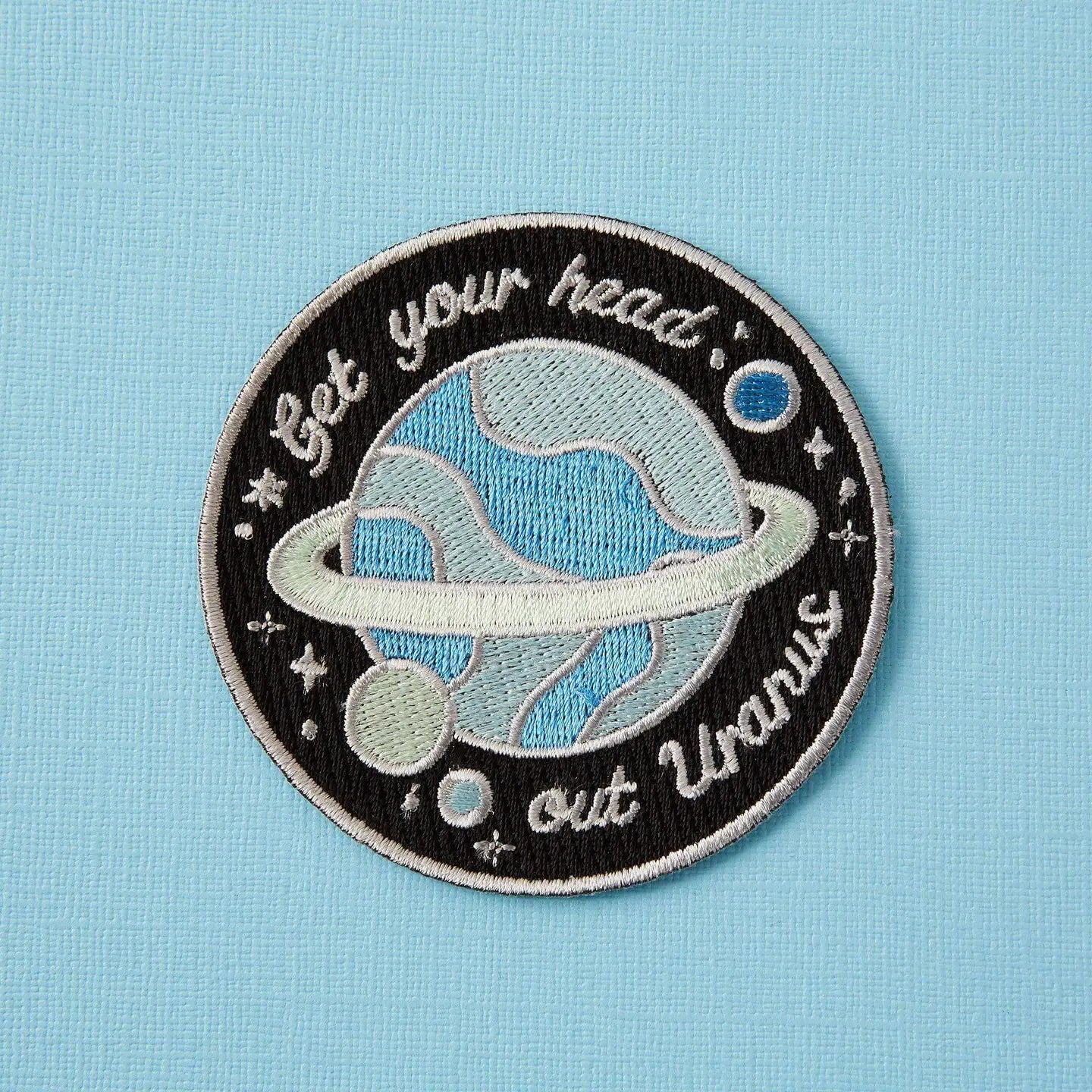 "Get Your Head Out Uranus" embroidered iron on patch: perfect for those who don't take themselves too seriously and want to add a playful touch to their clothing. Stand out and show off your unique sense of humor!