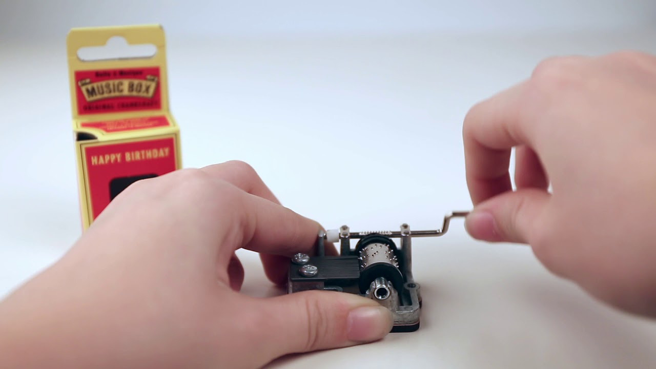 Original hand crank music box. Try on wood or glass or try different surfaces for a new sound. Screws included. Makes a sweet gift.