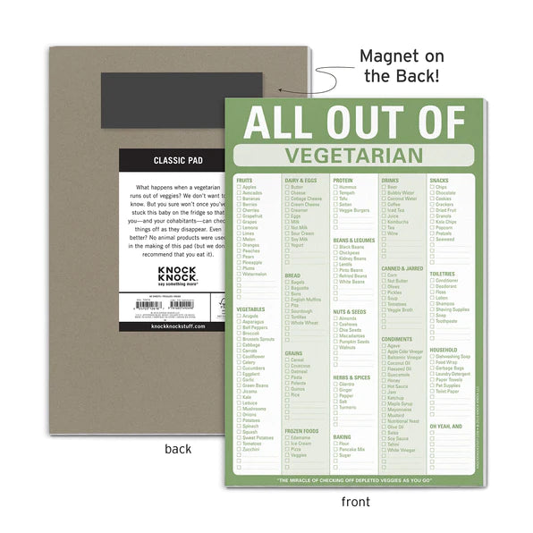 This bestselling All Out Of pad is now available especially for meat-free, veggie-lovin' foodies! Use this vegetarian shopping list to check off items as you run out, then replenish with ease and certainty next time you get groceries. You'll never be befuddled at the farmer's market, grocery store, or hippie food co-op again.