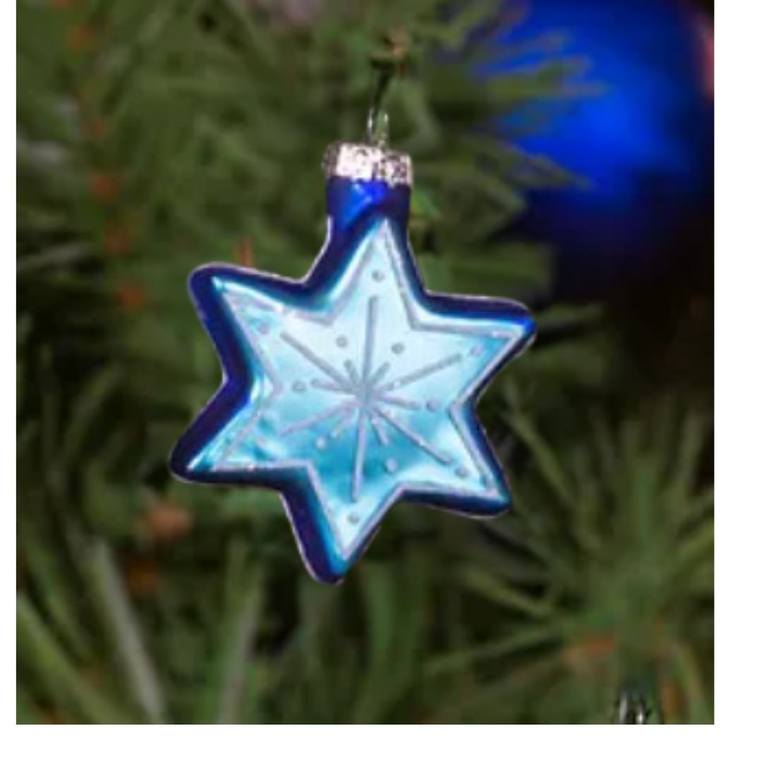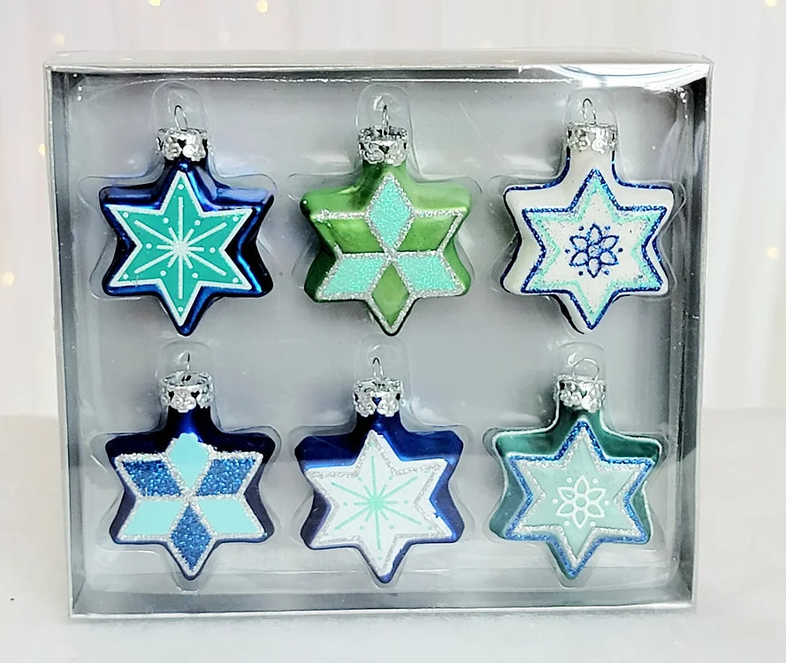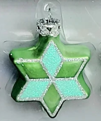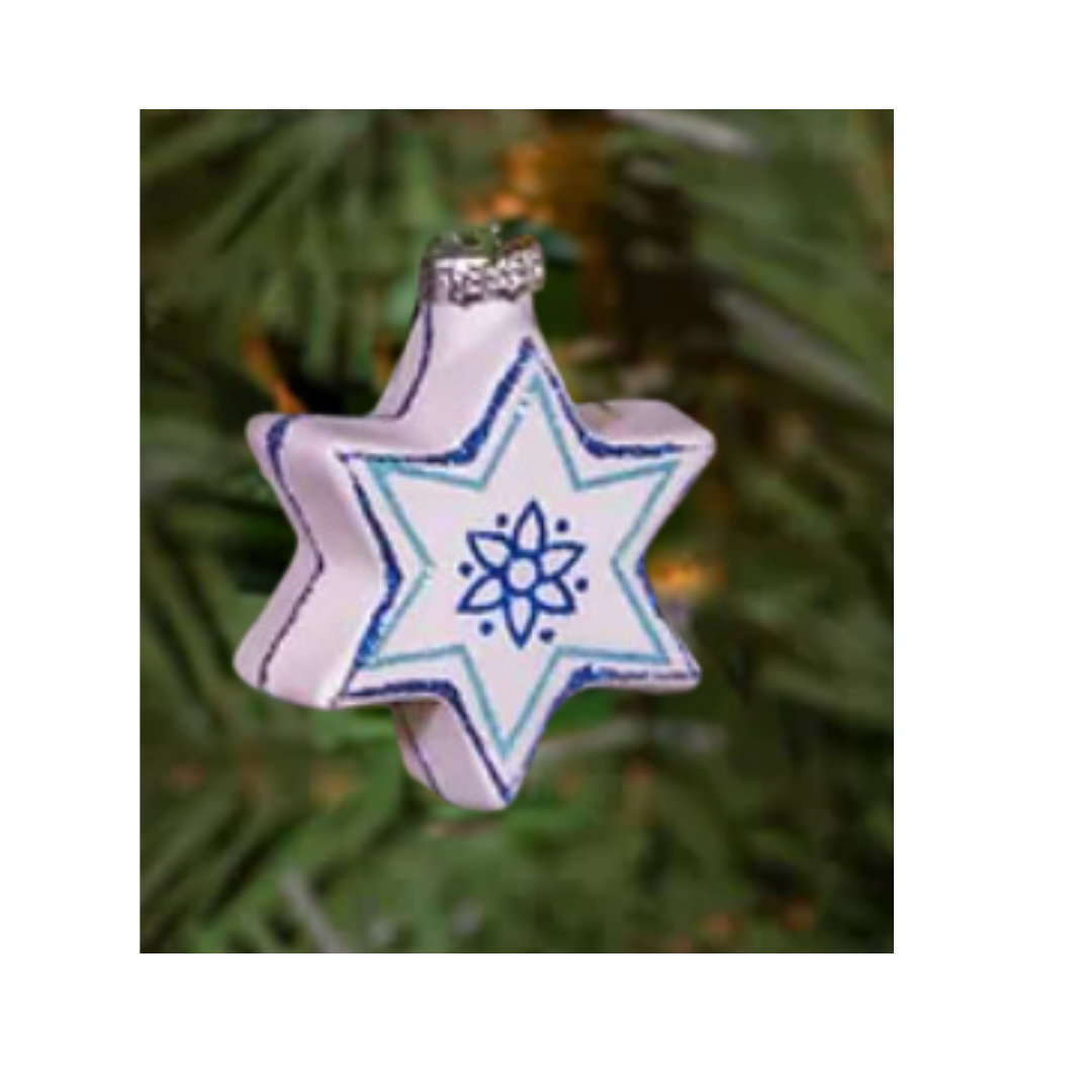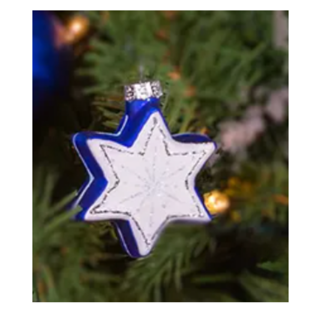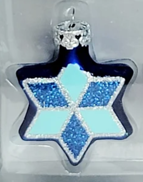 This glass Jewish stars with glitter ornament is a fun and festive addition to any holiday décor. Perfect for celebrating Hanukkah or for interfaith families, this ornaments features star ornaments in different blue and white glittered designs.