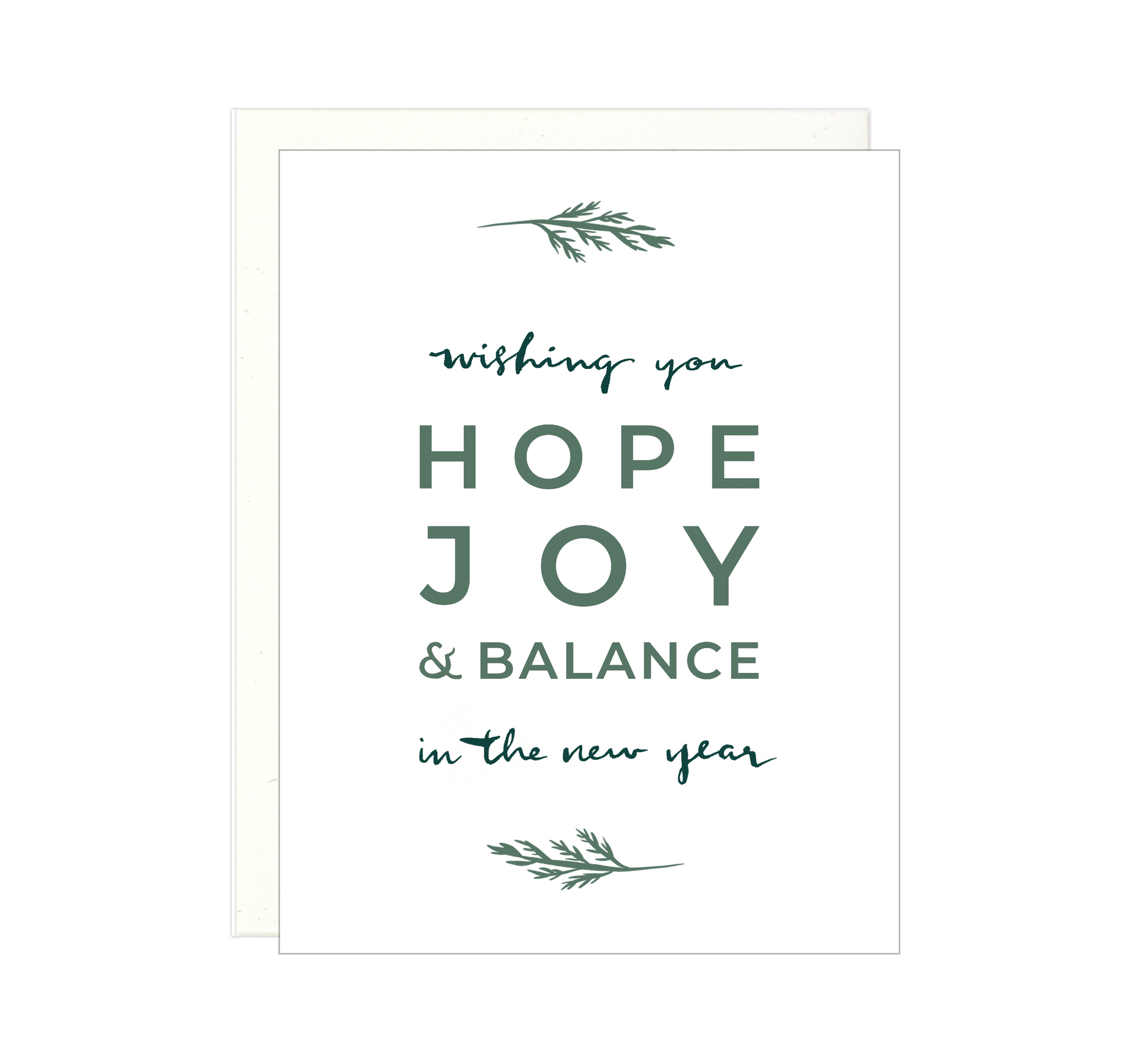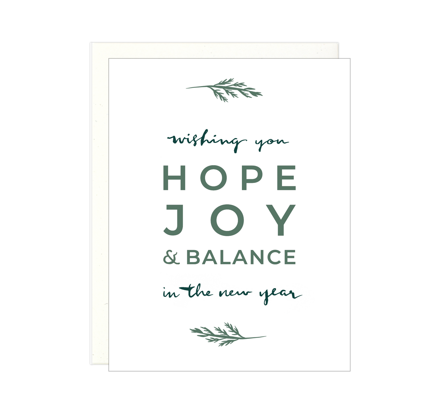 Wishing you hope, joy & balance in the New Year. A beautiful and hopeful message for the new year. Letterpress printed in two green tones.