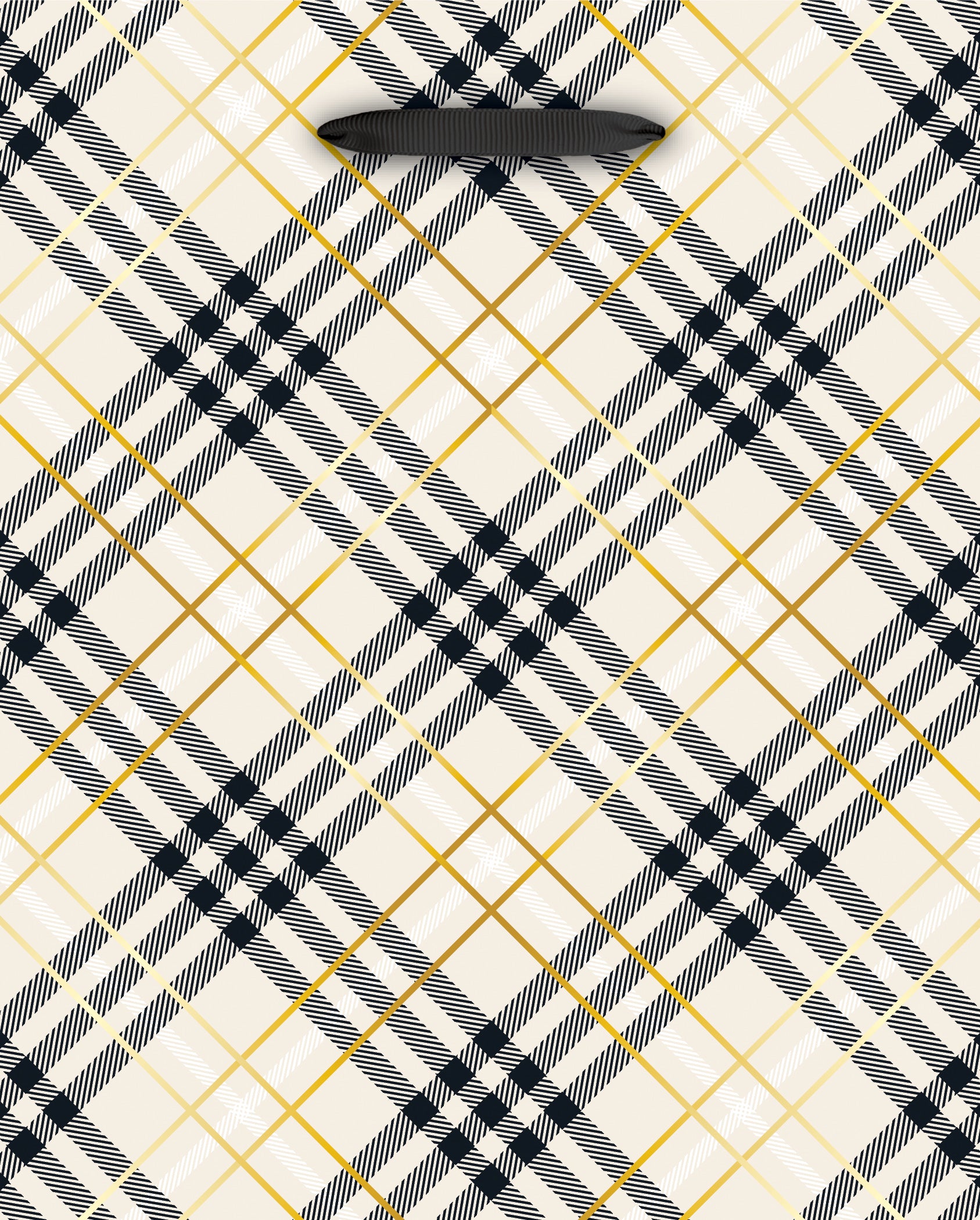 This small gift bag shines with a classic black and cream plaid pattern and shiny gold foil accents. Its gold satin handles make it fun to carry, perfect for adding a fancy touch to any celebration!