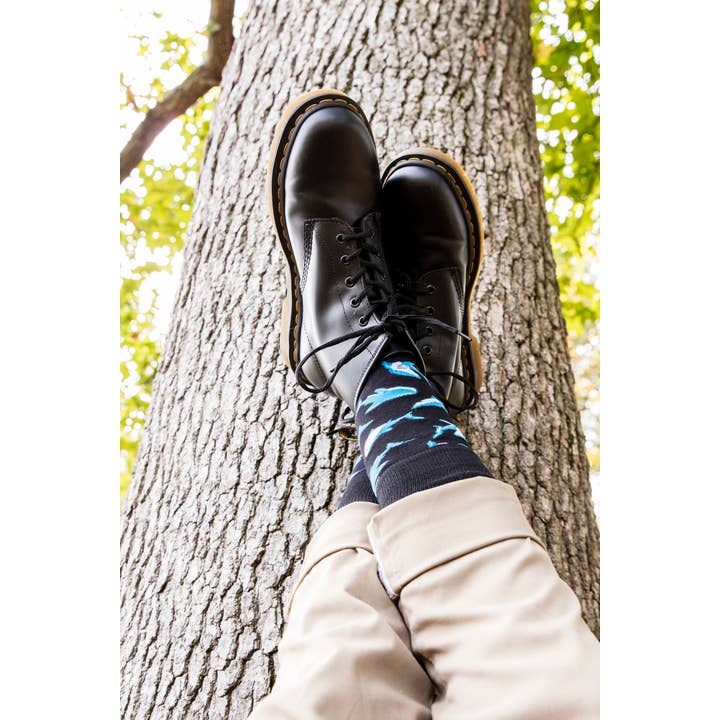 Introducing the Men's Bamboo Crew Socks in Black Shark Attack! These socks will make a splash with their bold design and eco-friendly bamboo material. Keep your feet cozy and planet-friendly with these socks. (Shark-Wear never looked so good!)