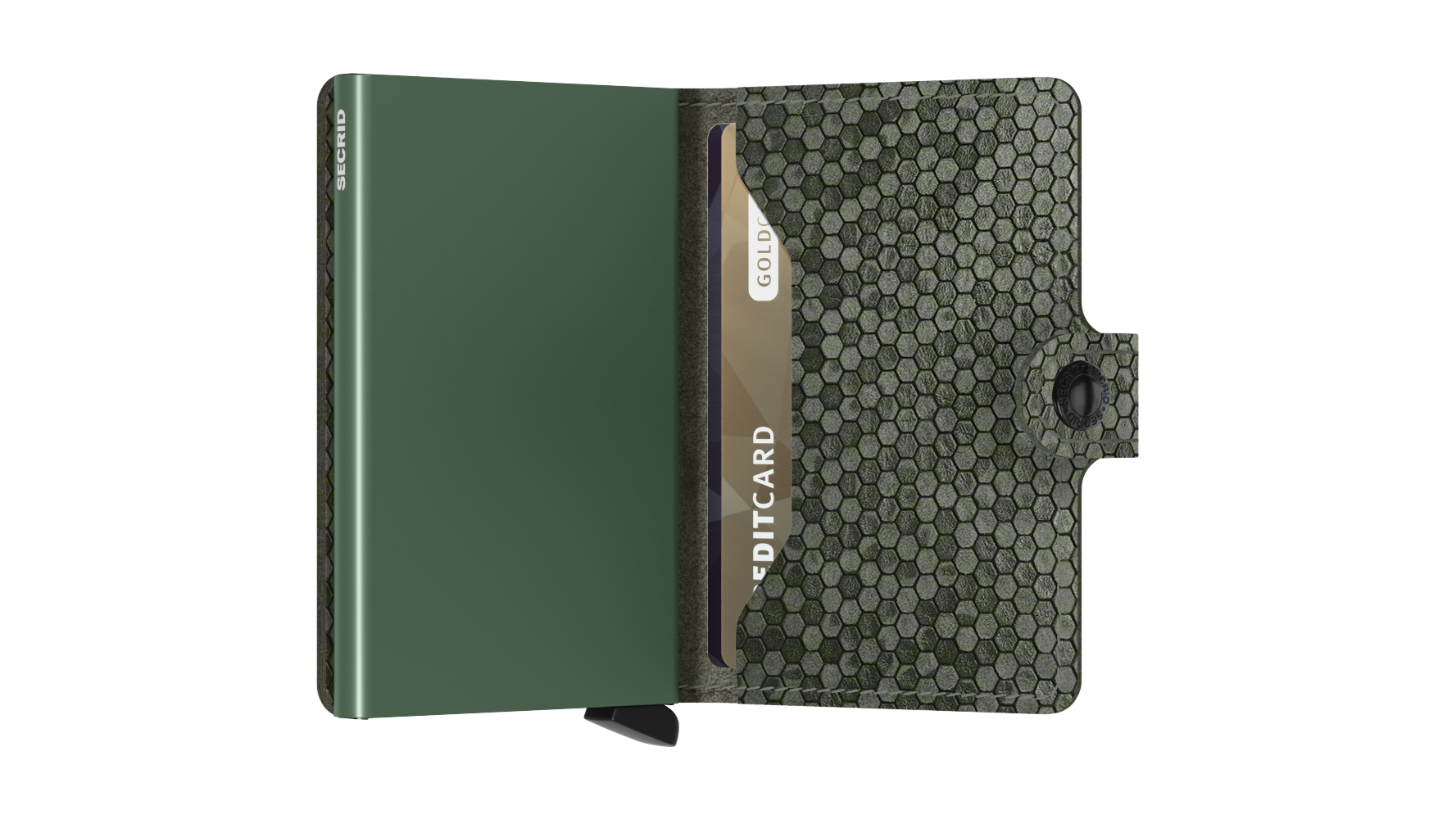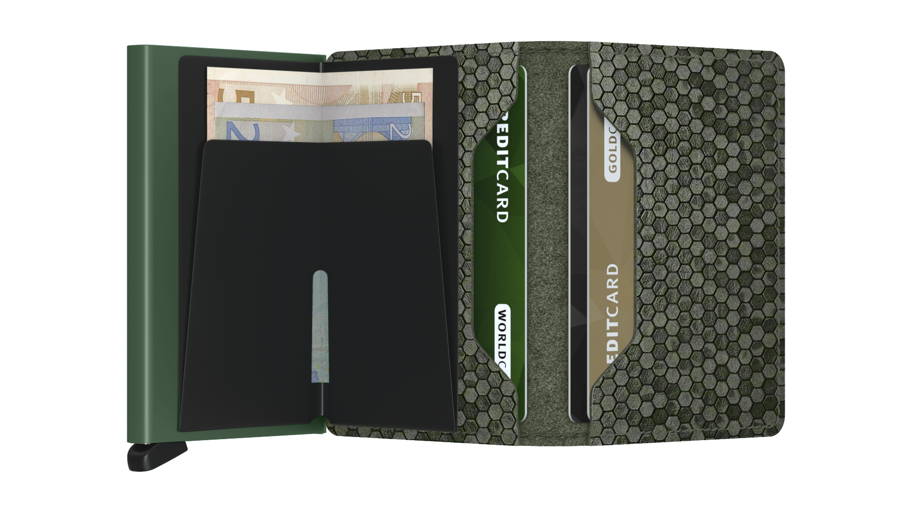 Get the best of both worlds with the Miniwallet Hexagon Green! This compact wallet holds banknotes, receipts, and cards while the aluminium Cardprotector keeps them safe and easily accessible. Say goodbye to bent, broken, and vulnerable cards - and hello to sleek, convenient storage!