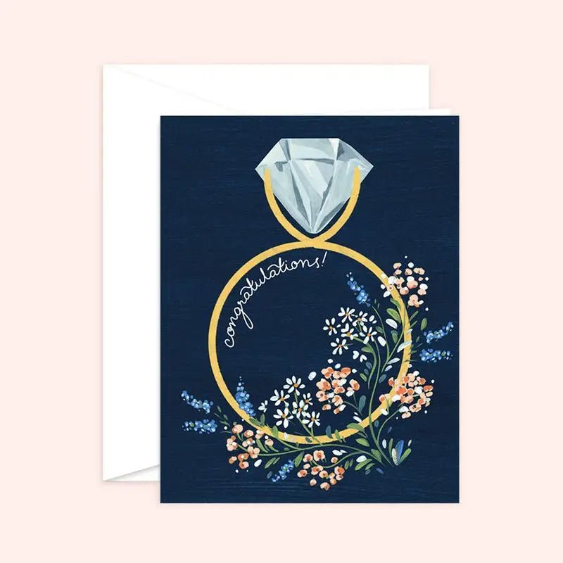 Celebrate love with this charming Navy Floral Engagement Card! Featuring a playful ring illustration and bold navy floral design, this card is perfect for congratulating the lucky couple.