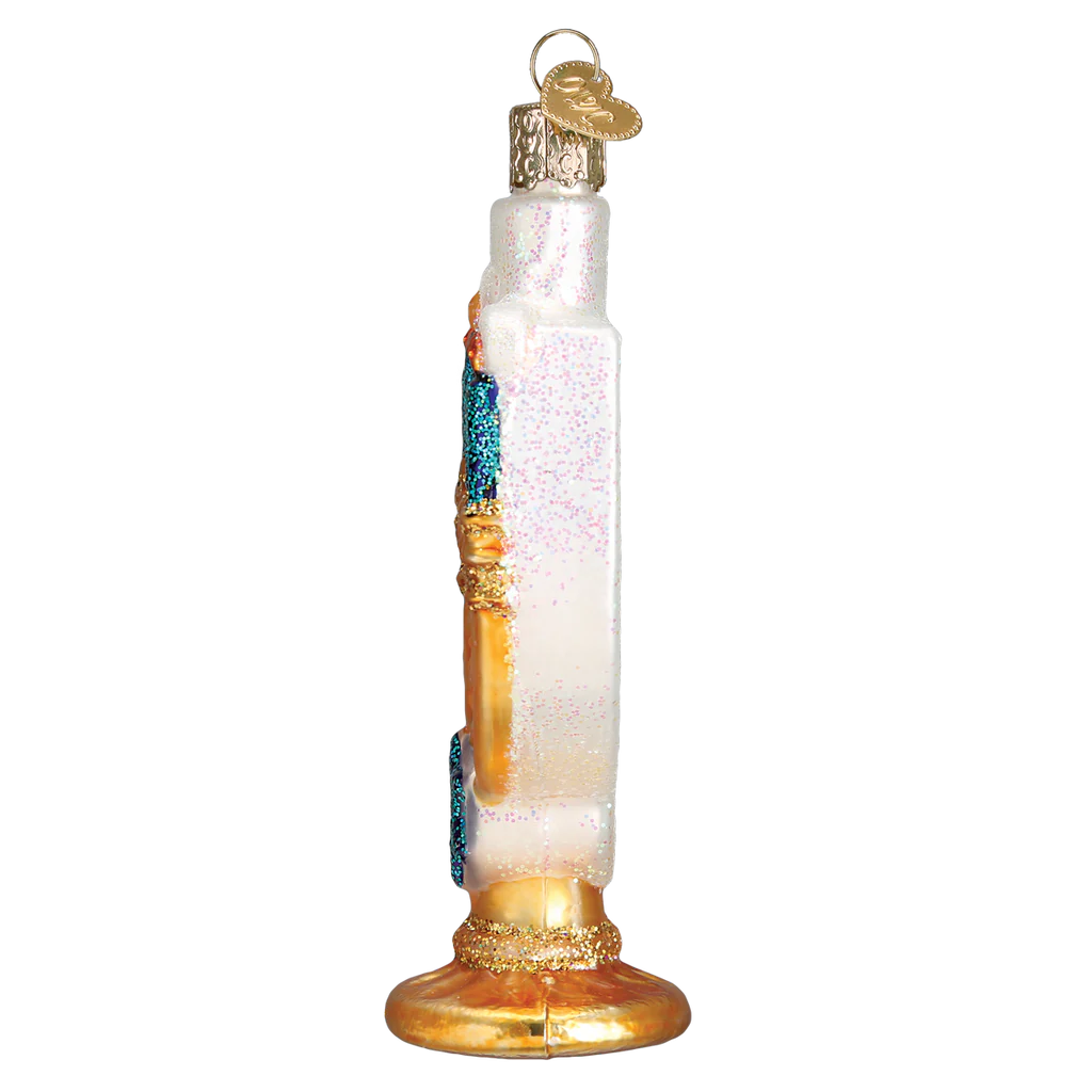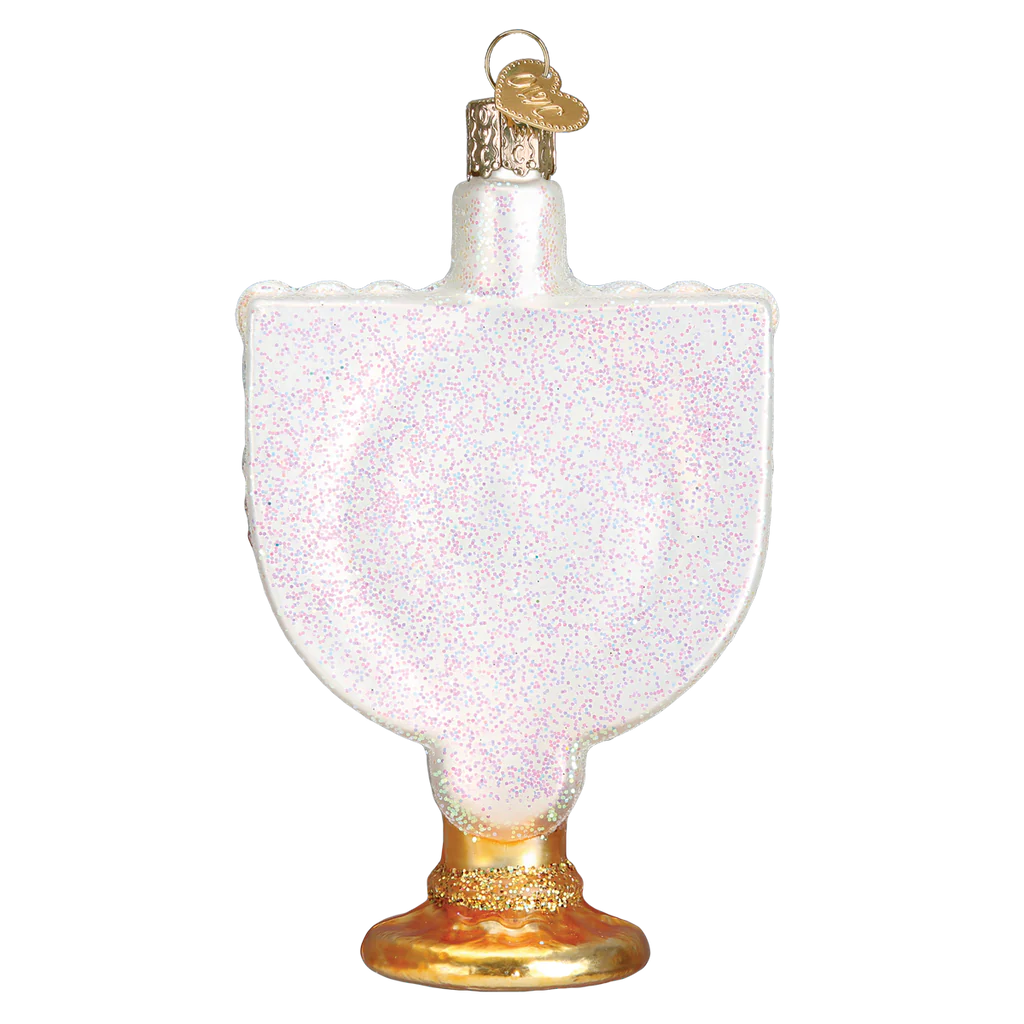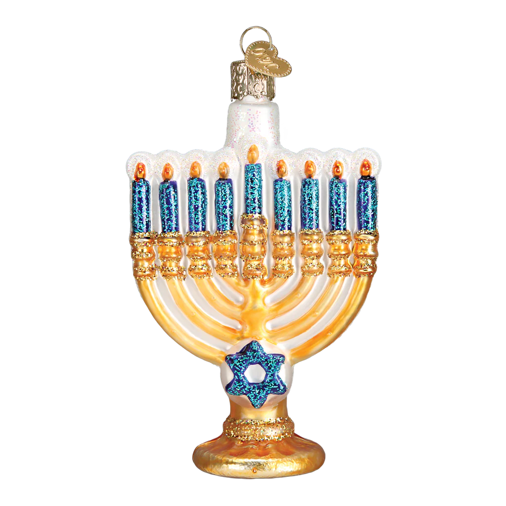Hanukkah Menorah shines brightly to commemorate the rededication of the Second Temple in Jerusalem in the 2nd century B.C. The Festival of Lights is celebrated for eight nights by lighting the menorah, playing dreidel, exchanging gifts and eating latkes (potato pancakes) and sufganiyot (jelly donuts). This lovely blown-glass ornament celebrates this festive time of year. Chag Sameach (Happy Hanukkah)!