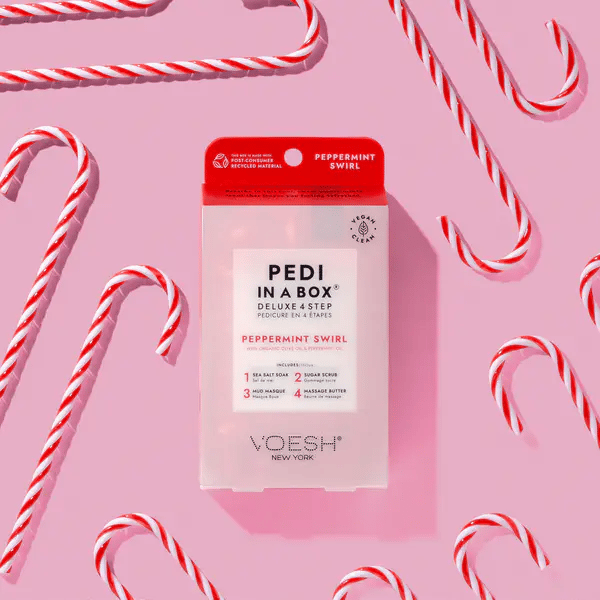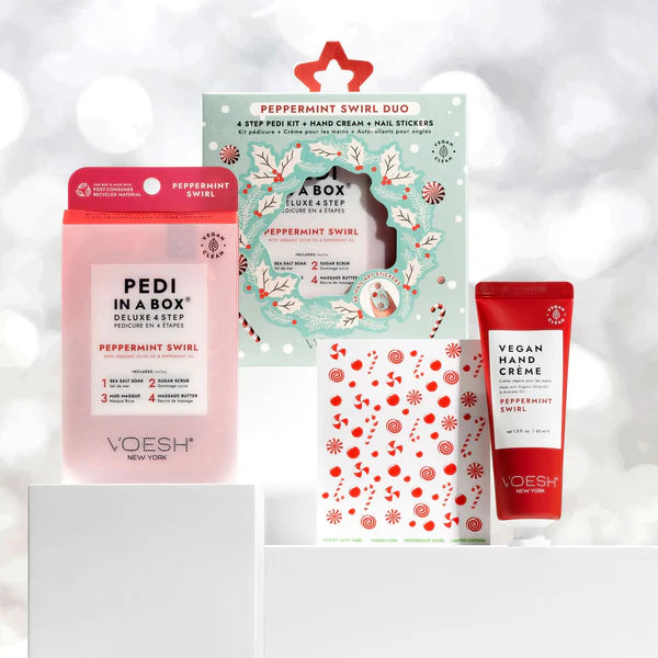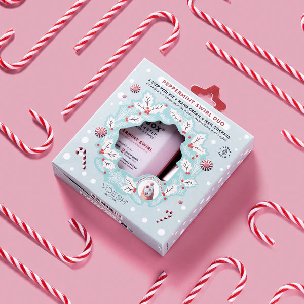 Indulge in some sweet holiday pampering with this Peppermint Swirl Duo! Our 4-step pedi kit, featuring peppermint oil and organic olive oil, rejuvenates tired feet, while our Vegan Hand Crème, complete with candy-cane-inspired nail stickers, nourishes and refreshes skin. Your self-care routine just got a fun and festive upgrade!