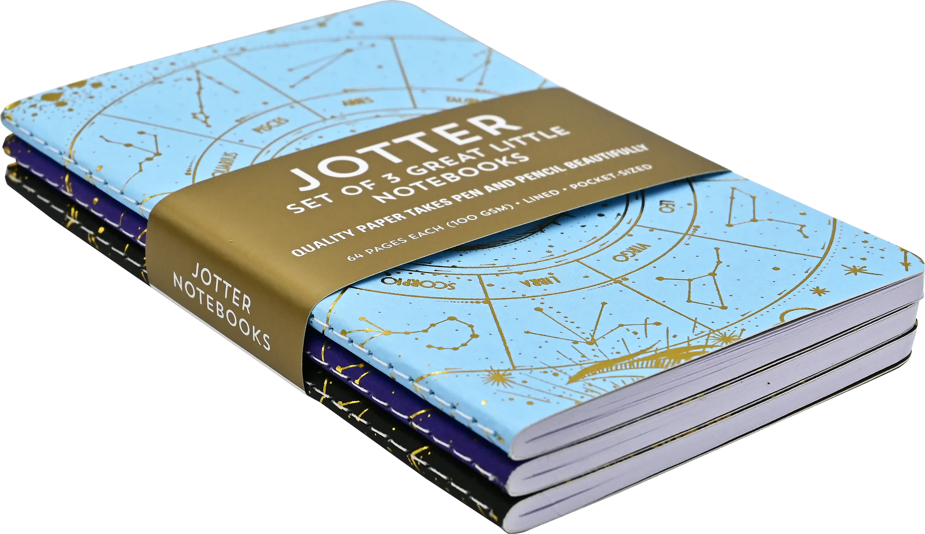 - Notebook cover design features a celestial theme, with the sun and moon surrounded by the constellations of the zodiac.