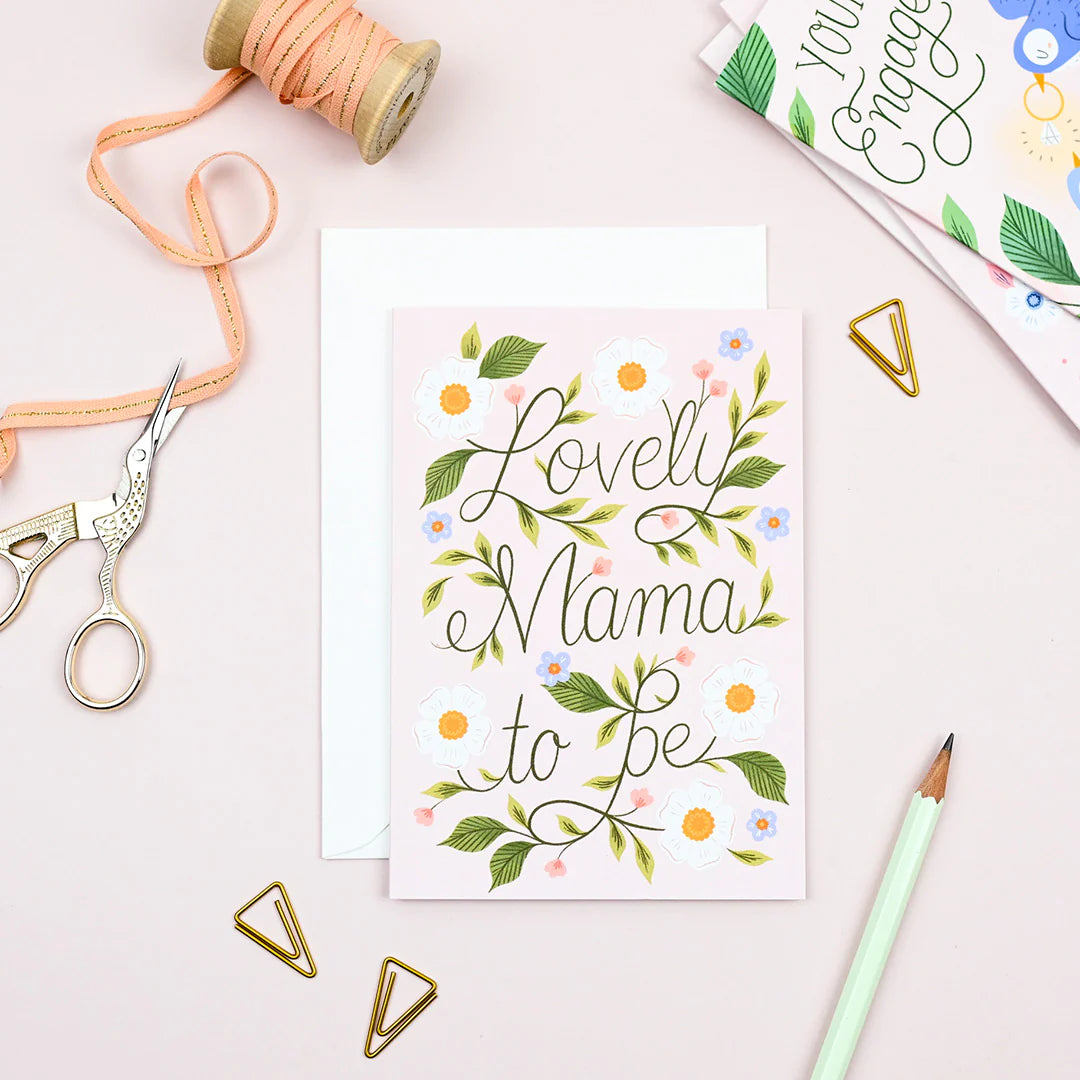 This maternity card is perfect for a soon-to-be mum. Give it to her at a baby shower or send a colleague off with your best wishes for their exciting new chapter. Sitting on a peachy pink background, the card features a hand-lettered 'lovely mama to be' greeting plus blooming, beautiful florals and foliage.
