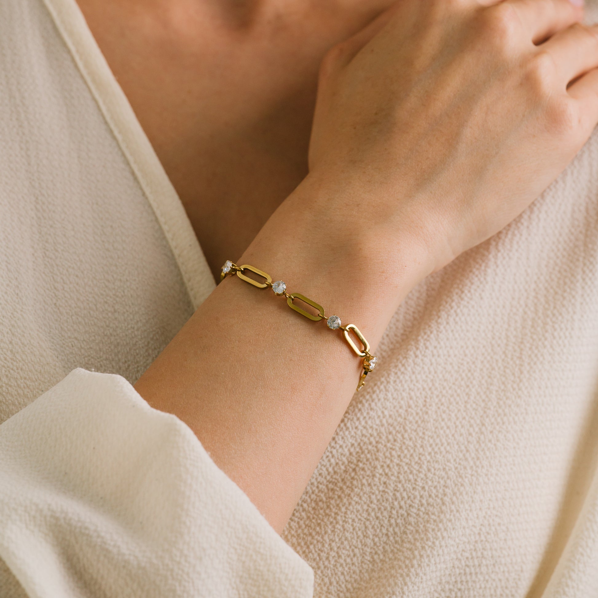 Gorgeous gold bracelet featuring sparkling cubic zirconia stones and a sleek U-link design. Perfect for any occasion, from nights out to everyday wear. Versatile, stylish, and fun.