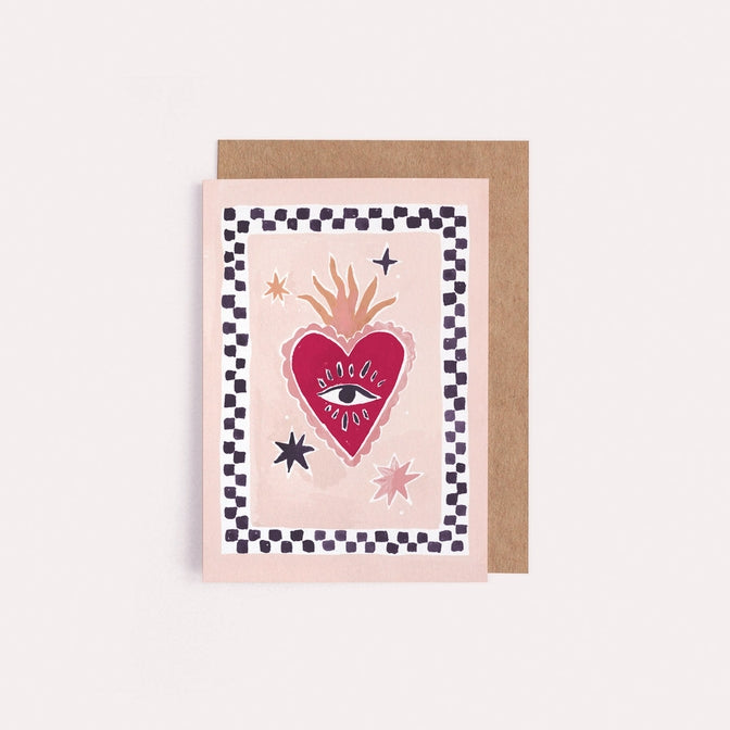 This mini card features the Sacred Heart symbol with a playful twist: a heart with an eye, framed by a checkerboard pattern, perfect for sharing a little fiery love.