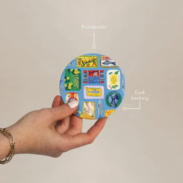 Add vintage coastal charm to your table with the Sardine Tins Coaster, featuring nostalgic hot foil stamped sardine tin designs that bring retro, nautical character to your home.