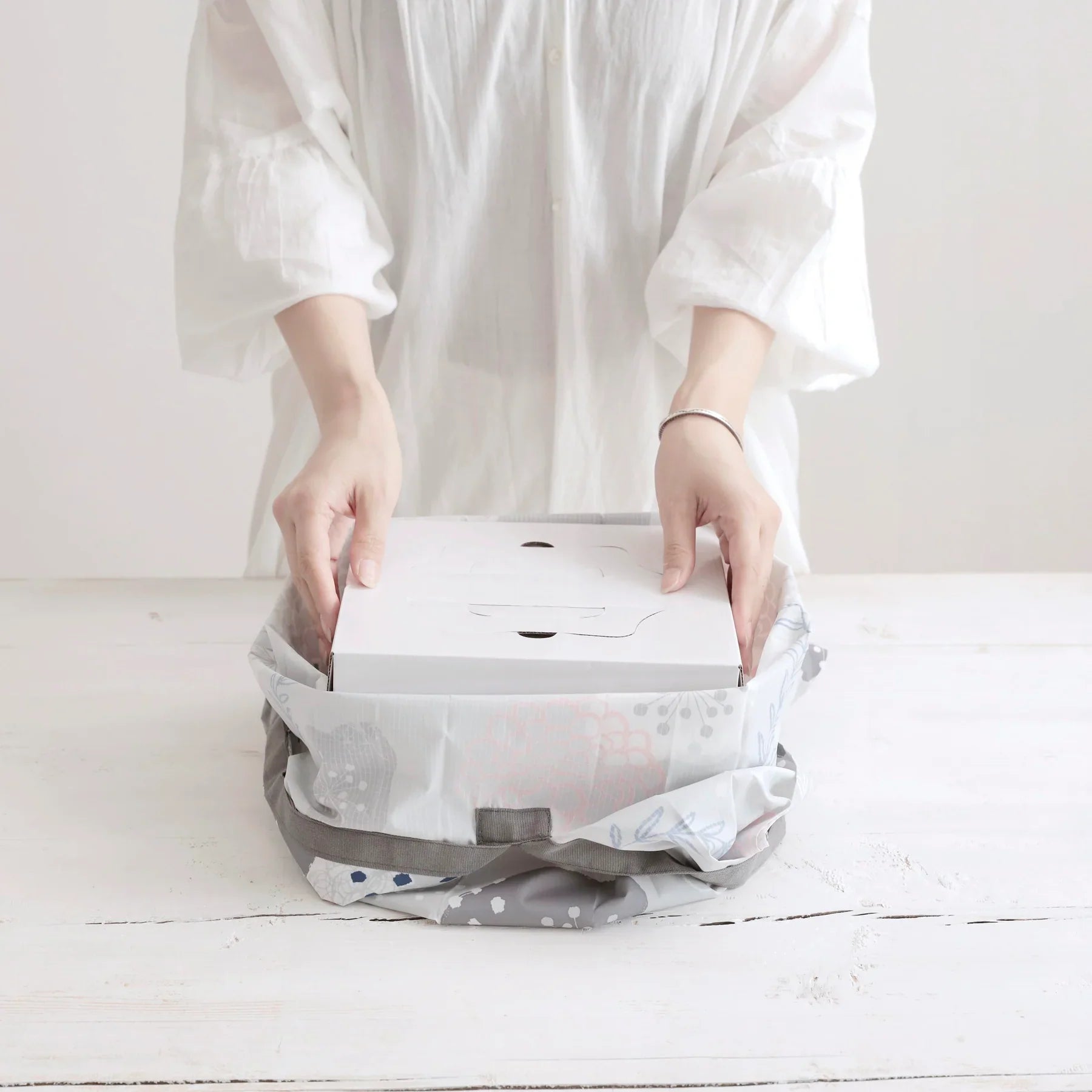 Pull the bottom and handles into a strip — it folds into a compact square about the size of a handkerchief. Tuck it into your main bag and you're ready to go.