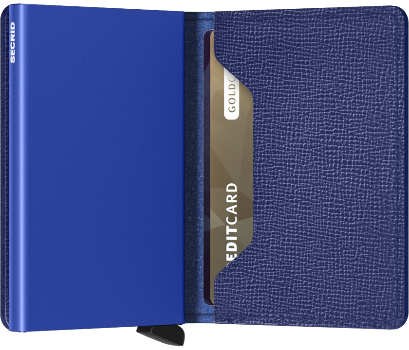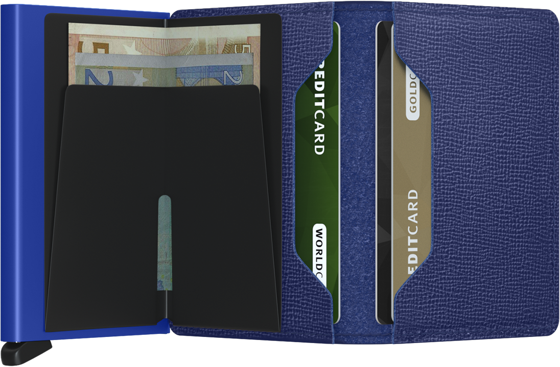 Its slim profile makes the Slimwallet fit perfectly into every pocket. The open exterior is cut extra wide to hold cards, banknotes and receipts. The Cardprotector mechanism allows you to slide out cards with one simple motion, while the aluminium protects your cards from bending, breaking and unwanted wireless communication.