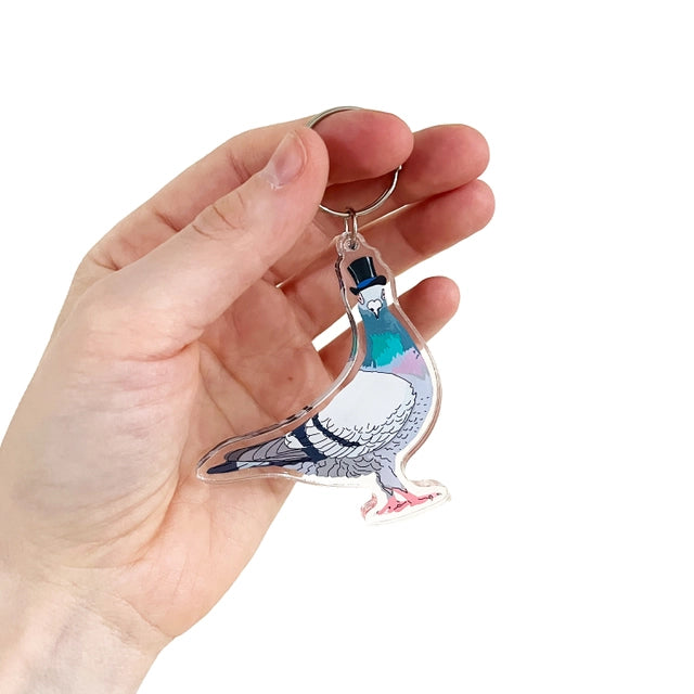 Keep your keys organized in style with this quirky keychain featuring a top hat-wearing pigeon. Show off your playful side and make a statement with this unique keychain.