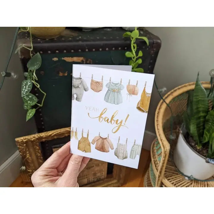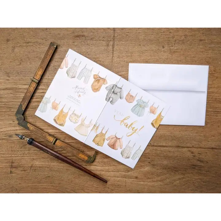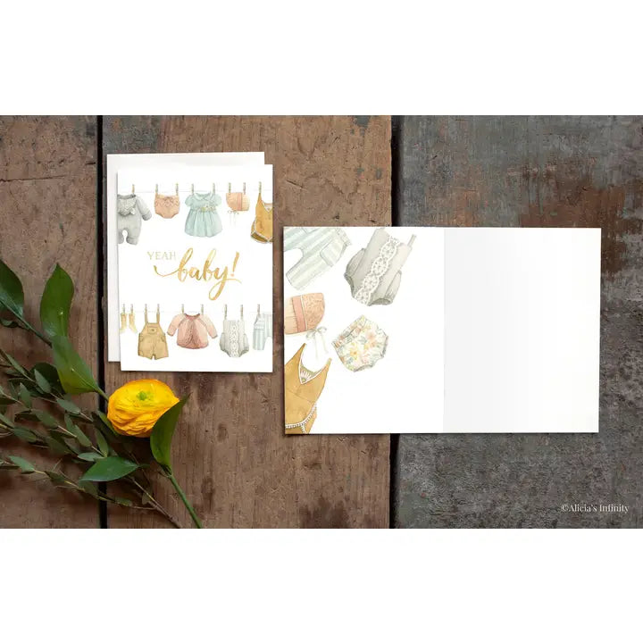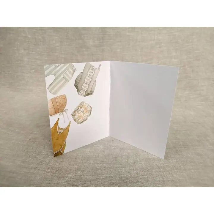 This charming card is perfect for a Baby Shower and works great as either a thank you or a congratulations card to accompany a gift! It showcases sweet vintage baby clothes on the front, back, and inside.