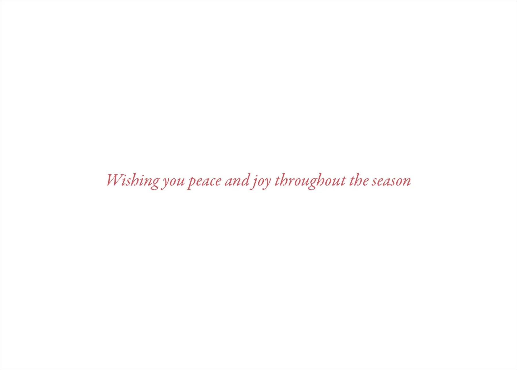 A gorgeous wreath of evergreens, eucalyptus, mistletoe, and holly serves as the backdrop for the word ''Peace'' on this elegant greeting card.