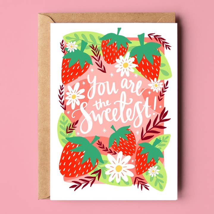 A lovely and gentle greetings card with the hand lettered 'you are the sweetest!' surrounded by fun and vibrant strawberry illustrations.