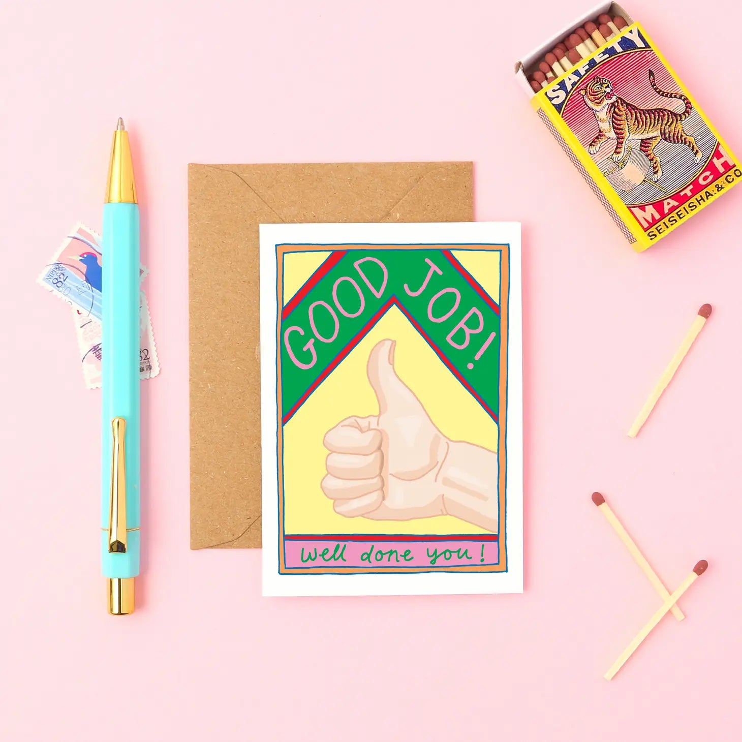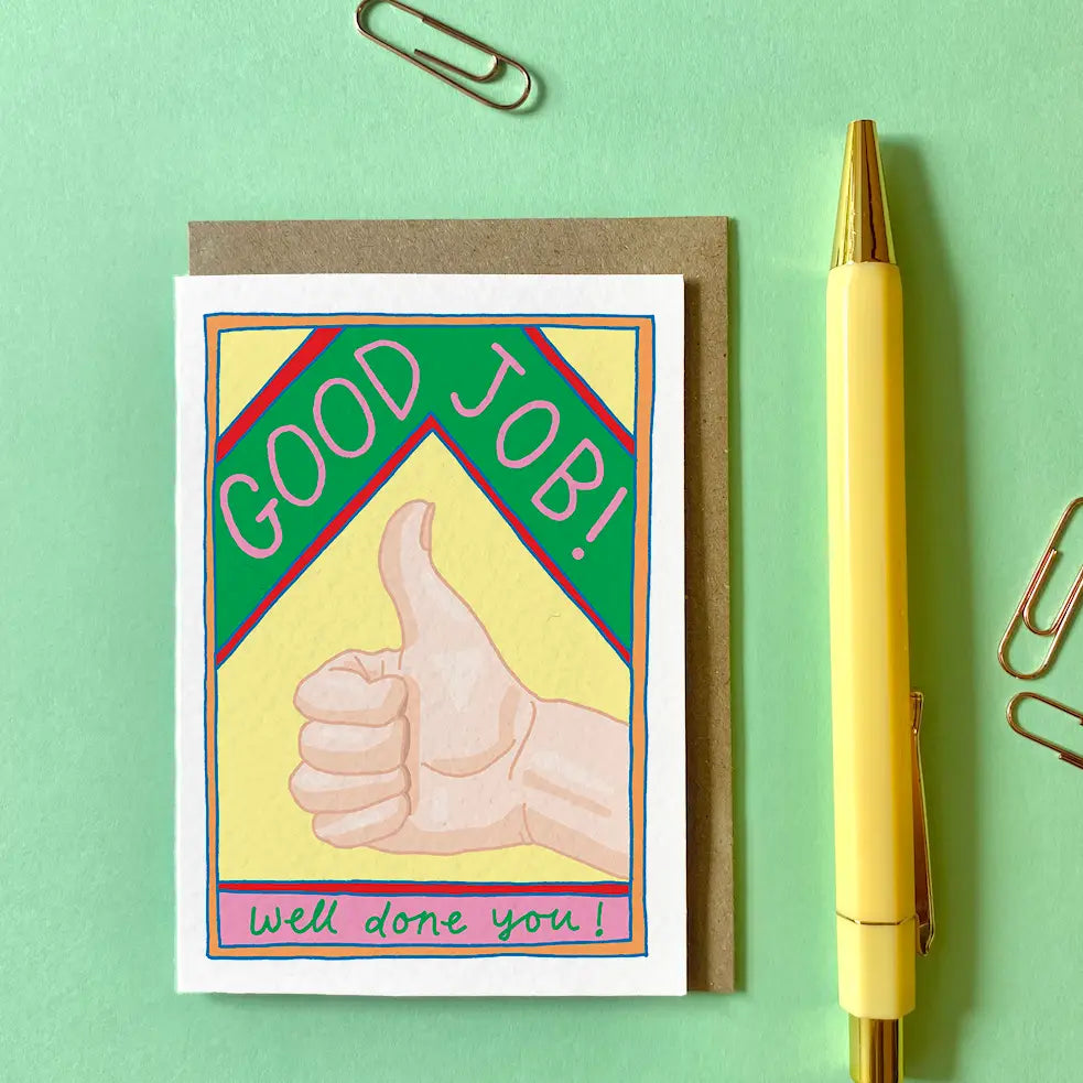 Good Job (well done you!). A celebratory card for many occasions. Featuring a white hand with a thumbs up.